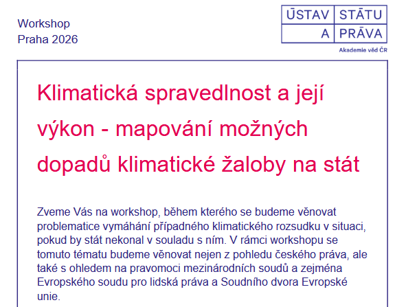 Zveme Vás na workshop pořádaný Ústavem státu a práva AV ČR s podporou Science4Policy dne 26. února, který bude zaměřen na problematiku vymáhání případného klimatického rozsudku v situaci, kdy by stát nekonal v souladu s ním. Téma bude uchopeno nejen z pohledu českého práva, ale také s ohledem na pravomoci mezinárodních soudů a zejména Evropského soudu pro lidská práva a Soudního dvora Evropské unie. Vystoupí: JUDr. Adam Novák, Ph.D., JUDr. Eva Balounová, Ph.D., LL.M., Mgr. Miroslav Kaštyl a JUDr. Natálie Polanská. Akce se koná prezenčně od 15 h v 7. patře budovy Ústavu státu a práva, Národní 18, Praha 1. Podrobnosti naleznete v přiložené pozvánce.